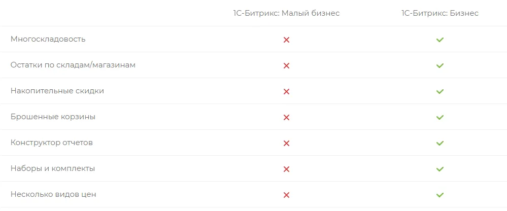 - «1С-Битрикс: Малый бизнес» подойдет для розничных магазинов, так как в редакции доступен только один тип цен. Хотя сайты оптовых продаж с b2b-кабинетом можно делать и на этой редакции через механизм скидок для каждого типа клиентов.