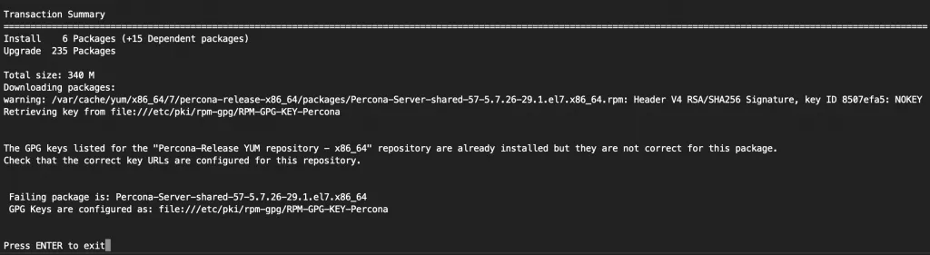The GPG keys listed for the "Percona-Release YUM repository - x86_64" repository are already installed but they are not correct for this package.