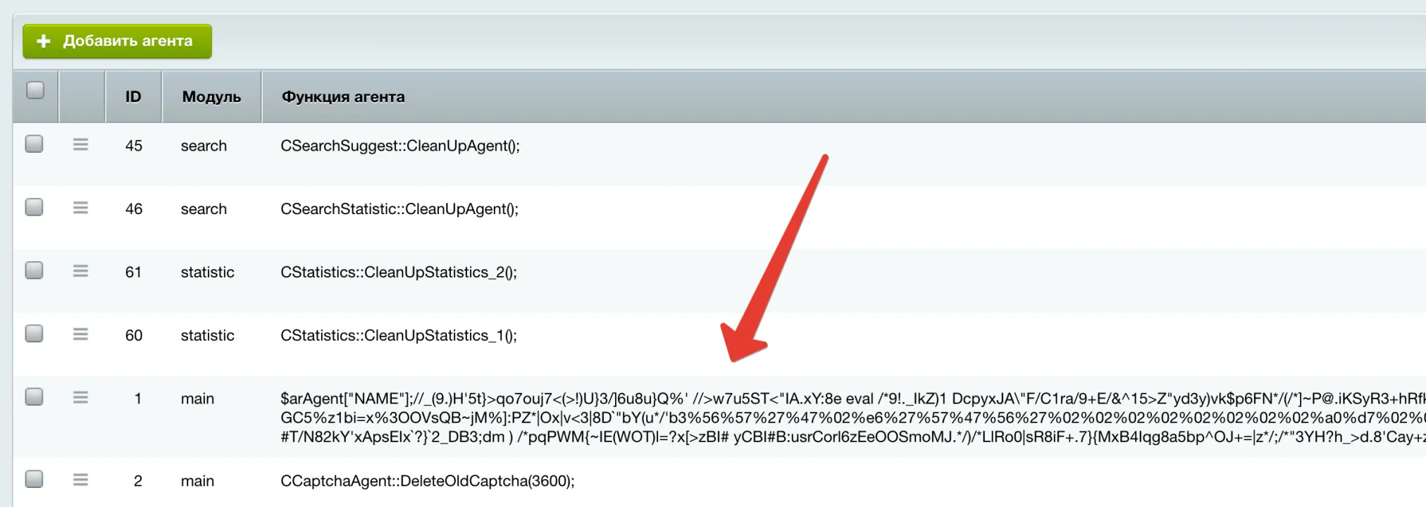 2. Пробуем зайти в админку. Тут или пустит или не будет работать вся админка полностью. Заходим в раздел "Агенты" и находим агент с подозрительным кодом (будет много зашифрованных команд в несколько строк). Удаляем этот Агент. В моем случае смог только посмотреть id этого агента и удалил его через api bitrix: https://dev.1c-bitrix.ru/api_help/main/reference/cagent/delete.php