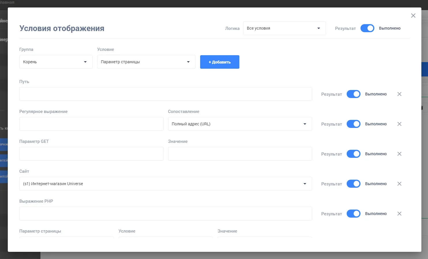 Вы можете задавать логику появления определенных блоков, например, лид-форм, сквозных