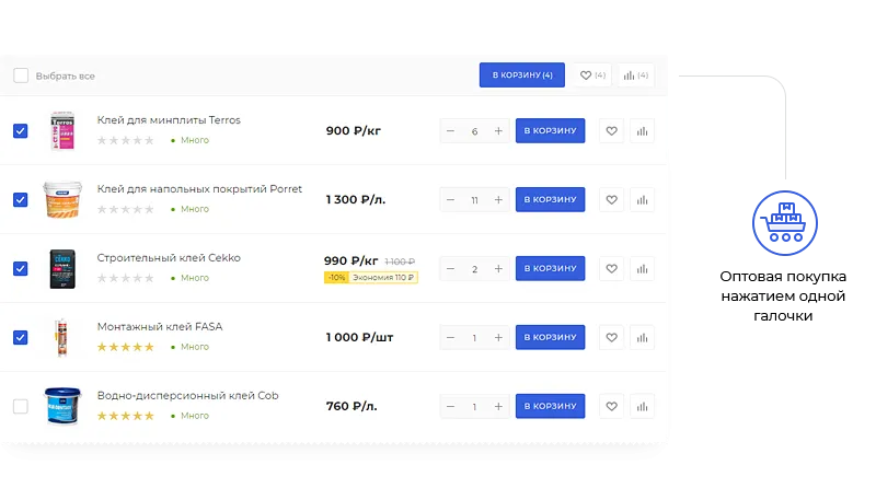 Массовая покупка в интернет-магазине отличается от розничной. Как правило, это быстрые транзакции по персональным ценам. Поэтому добавление товара в корзину должно быть предельно удобным и простым.
