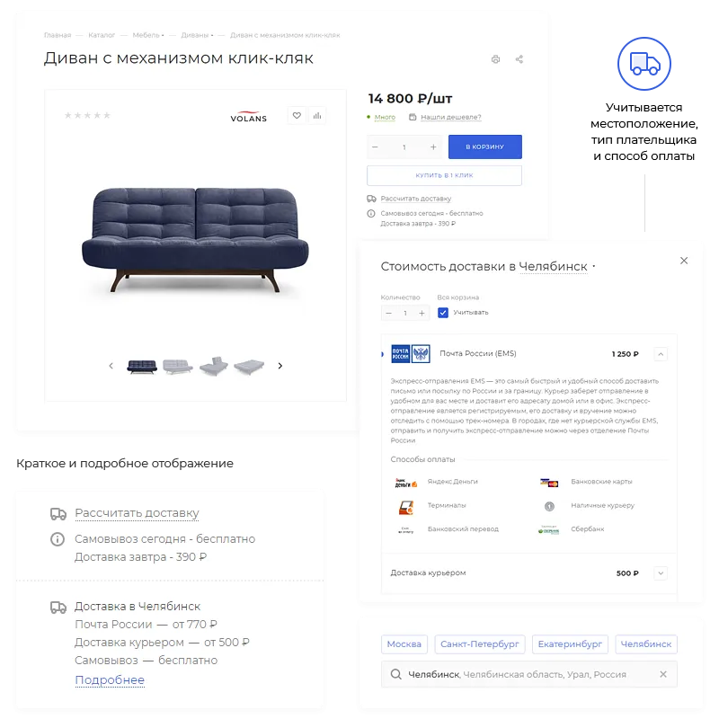 В Аспро: Максимум доставка рассчитывается прямо в карточке товара. Информация берется из подключенных служб доставки и зависит от их условий. Вы можете сами выбрать, какие отображать варианты — самовывоз, почта или курьер. Учитывается местоположение клиента, тип плательщика и способ оплаты. Стоимость доставки отображается как для отдельного товара, так и для всей корзины целиком.