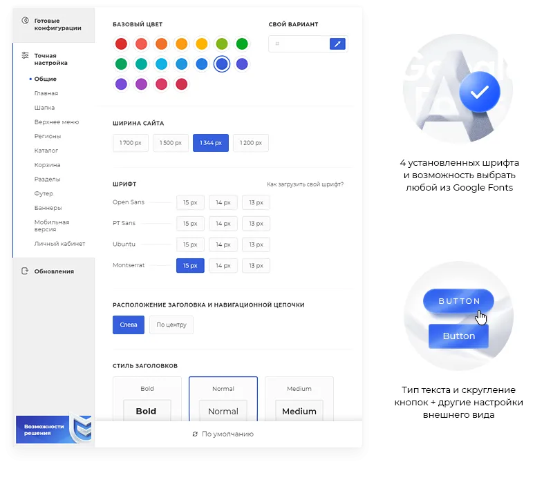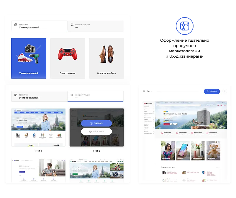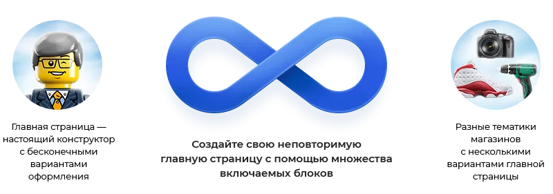 Готовые конфигурации — набор настроек оформления под определенную тематику. Структура сайта, комбинации блоков на главной странице, вид разделов, товаров и другие настройки помогут быстро запустить интернет-магазин.