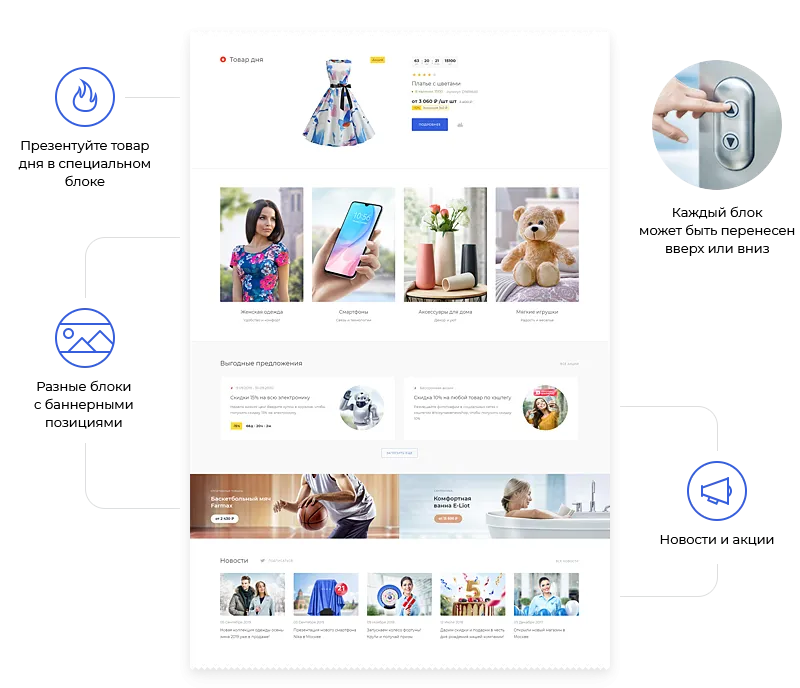 Соберите главную страницу под свои предпочтения — включите только нужные блоки, настройте порядок их отображения и выберите подходящий дизайн. Цепляйте взгляды и презентуйте товары с помощью ярких баннеров.