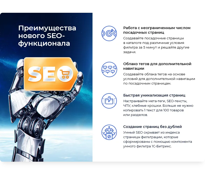 Функционал уже внедрен в Аспро: Максимум с версии 1.4.0 и решает задачи бизнеса. Подробнее разобраться с настройками поможет пользовательская документация и видеообзор. Просто настройте SEO, все остальное продумали мы!