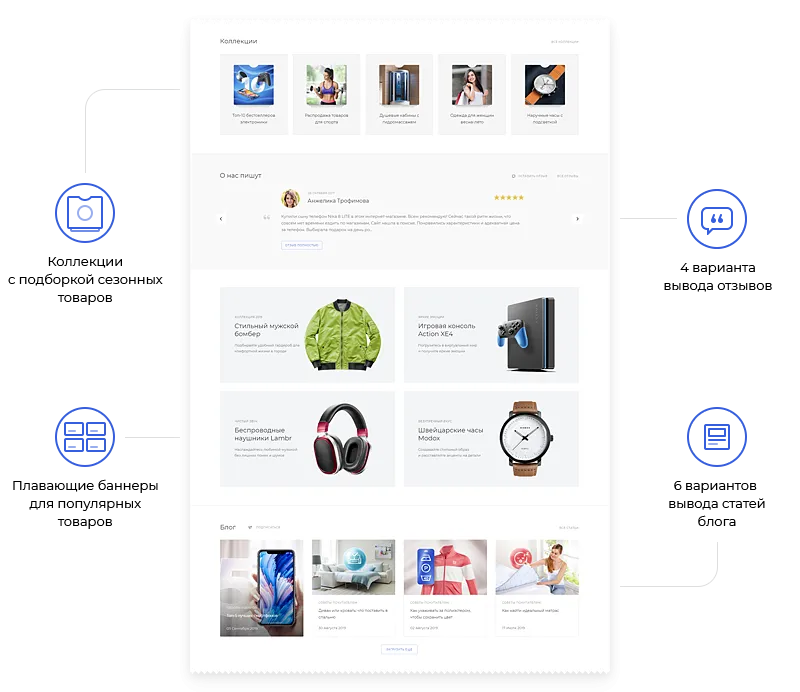 - Отображайте коллекции с подборкой сезонных товаров и другое.