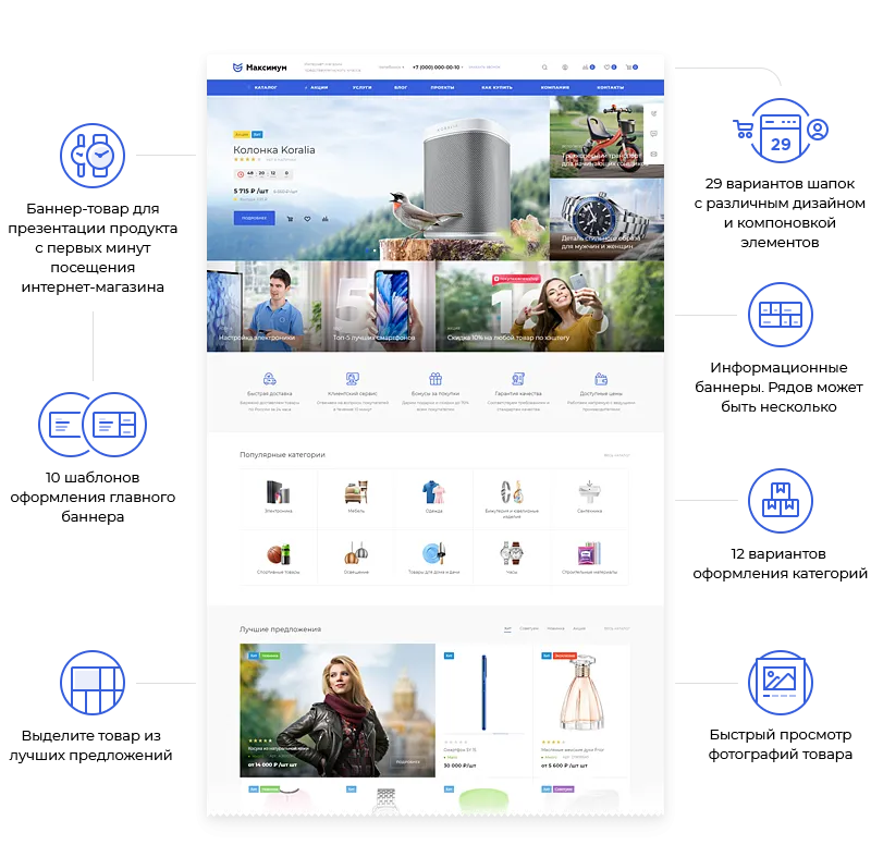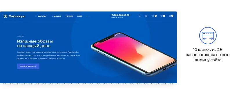 Подбирайте свои комбинации блоков, отображение разделов, товаров и других элементов интернет-магазина. Презентуйте компанию в вашем фирменном стиле, адаптируйте + под свои задачи и расставляйте акценты там, где этого требует ваш проект.