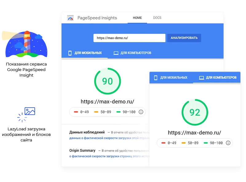 Новая технология увеличивает скорость загрузки демо-версии Аспро: Максимум до 90 баллов для мобильных и до 92 баллов для компьютеров. Данные были получены 19 ноября 2019 года на хостинге Reddock с помощью Google PageSpeed Insight. Используйте эту возможность и опережайте конкурентов!