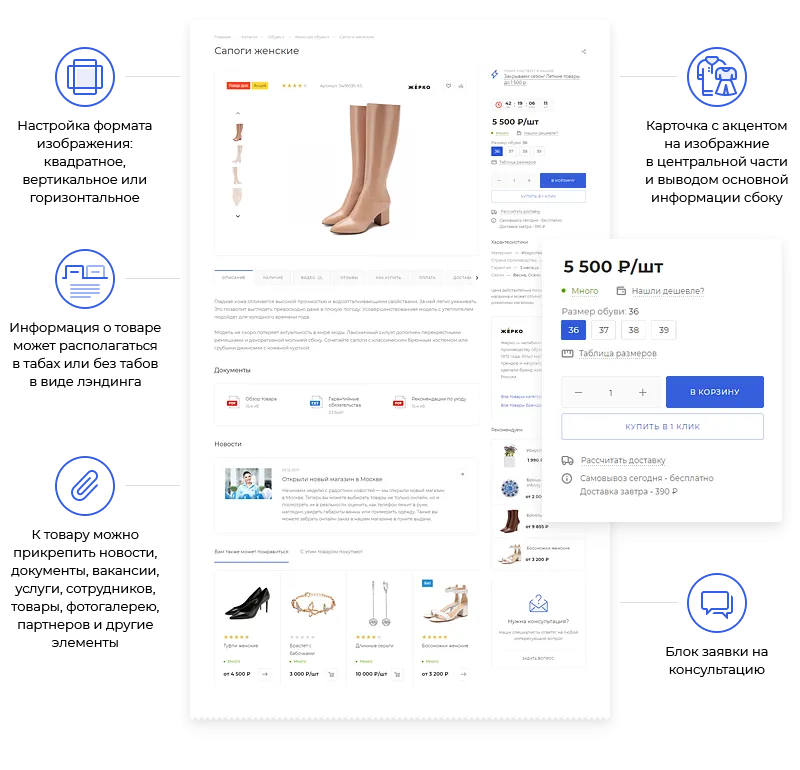 - Дополнительные табы с информацией об условиях доставки и оплаты.