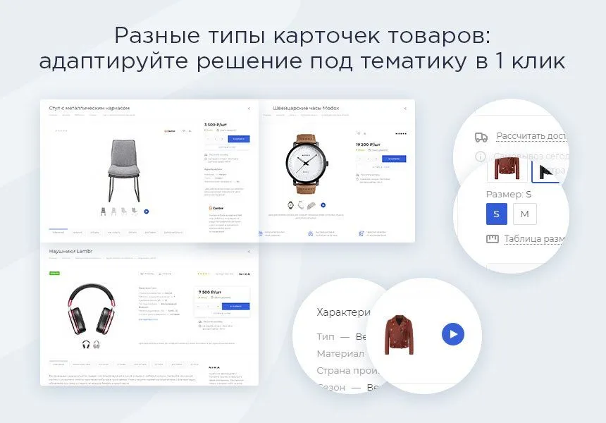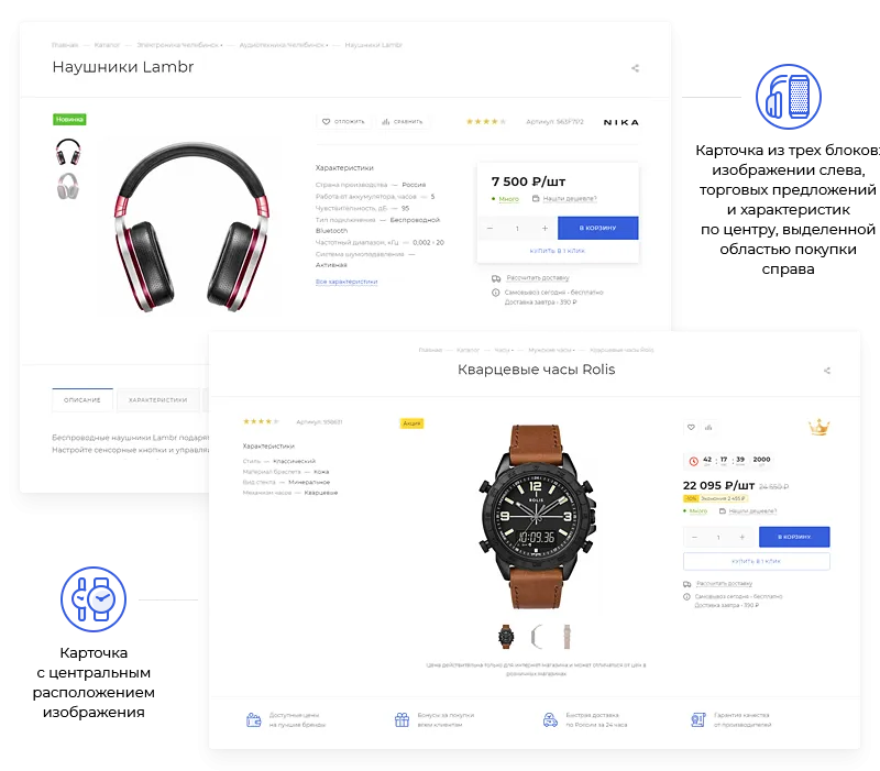 В Аспро: Максимум настроить карточку товара можно под любую тематику. Магазину одежды и бижутерии подойдет вариант с акцентом на изображение в центральной части экрана и выводом основной информации сбоку. А магазину электроники — карточка товара, состоящая из трех блоков: изображения слева, торговых предложений и характеристик по центру, выделенной областью покупки справа.