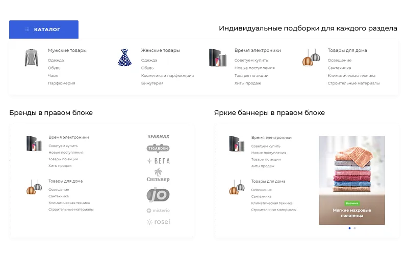 В Аспро: Максимум настроить пункты меню в шапке можно индивидуально для каждого раздела. Создавайте подборки с помощью фильтра, ведите на самые востребованные товары или популярные запросы. Дополнительно можно включить правый блок. В нем могут быть логотипы брендов или яркие баннеры для привлечения внимания. Выбирайте сами, из каких пунктов будет состоять меню вашего интернет-магазина!