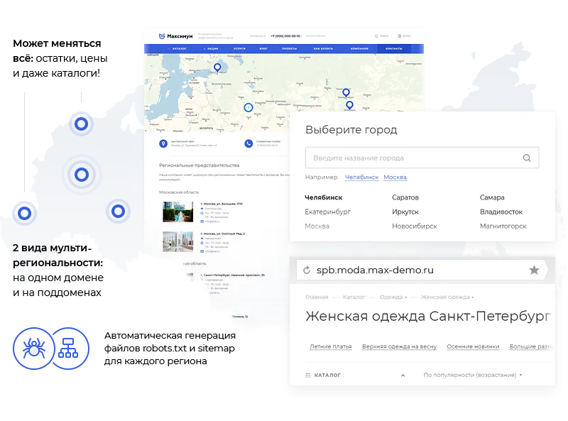 Настроить мультирегиональность просто. Достаточно выполнить настройку один раз, и функционал будет работает в автоматическом режиме. Каждому региону будет доступно свое SEO-продвижение. Сократите ресурсы на запуск интернет-магазина в нескольких городах!