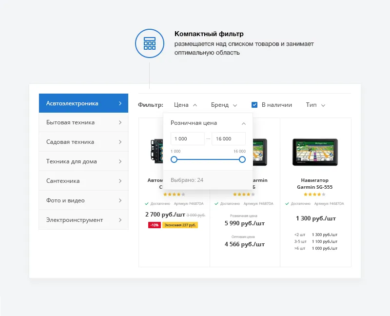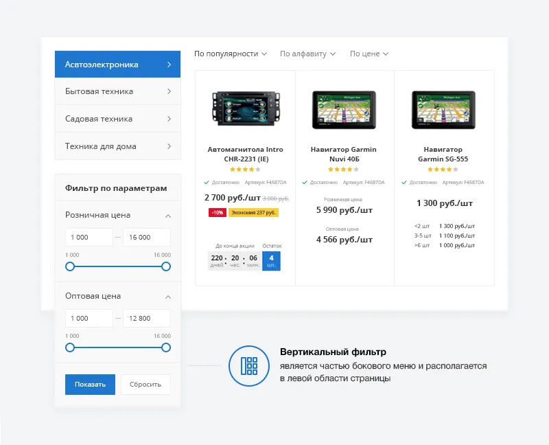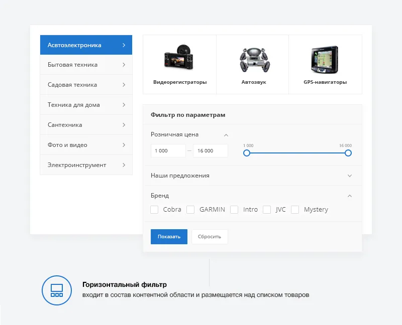 Интернет-магазин — онлайн-витрина товаров. Здесь ищут, выбирают, сравнивают. Поэтому подбор товаров должен быть удобным не только через поисковую строку, но и с помощью умного фильтра. В интернет-магазине доступно 3 варианта фильтра: вертикальный, горизонтальный и компактный.