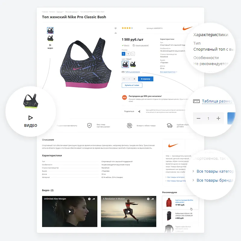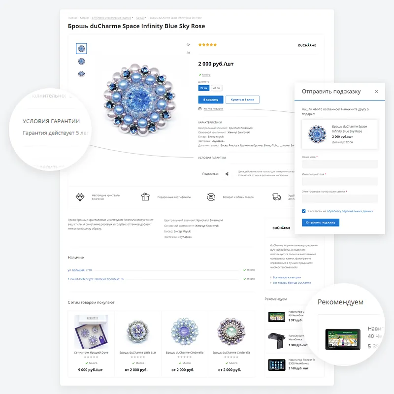- Поддержка сервиса 1C-Битрикс: BigData (блок «Персональные рекомендации» на главной странице, в карточке товара и в корзине)