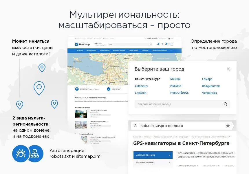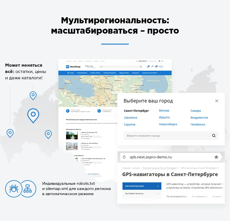 С выходом Аспро: Next запустить крупный федеральный ecommerce-проект стало проще. Если вы имеете сеть представительств по миру или стране, настройте мультирегиональность с возможностью выбора округа, региона, города и связкой сервисом геолокации Geo IP. Ваши посетители увидят не только актуальные контакты для их местоположения. Может меняться все: остатки, цены и даже каталоги!