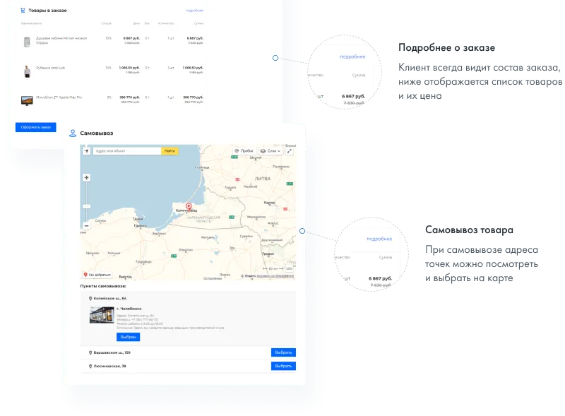 - гибкая настройка карточки товара: несколько типов товаров (промышленные товары, потребительские товары, одежда, услуги, недвижимость), выбор типа SKU, быстрый просмотр;