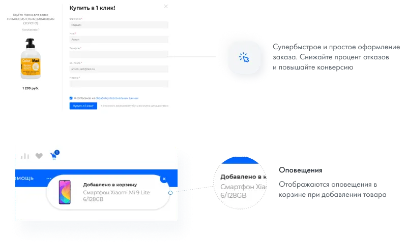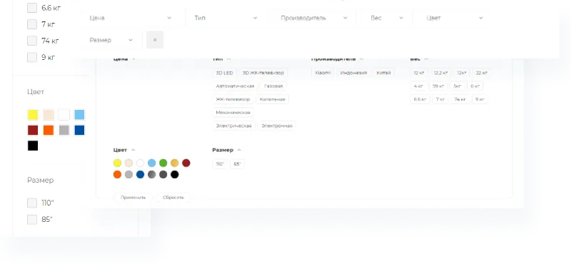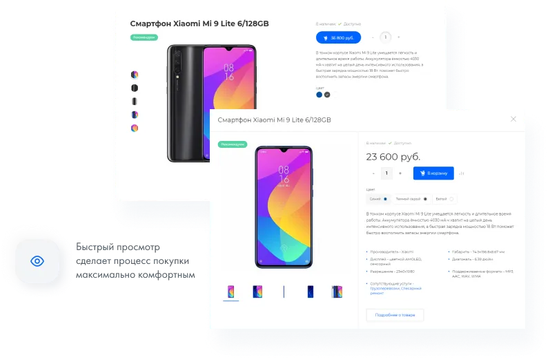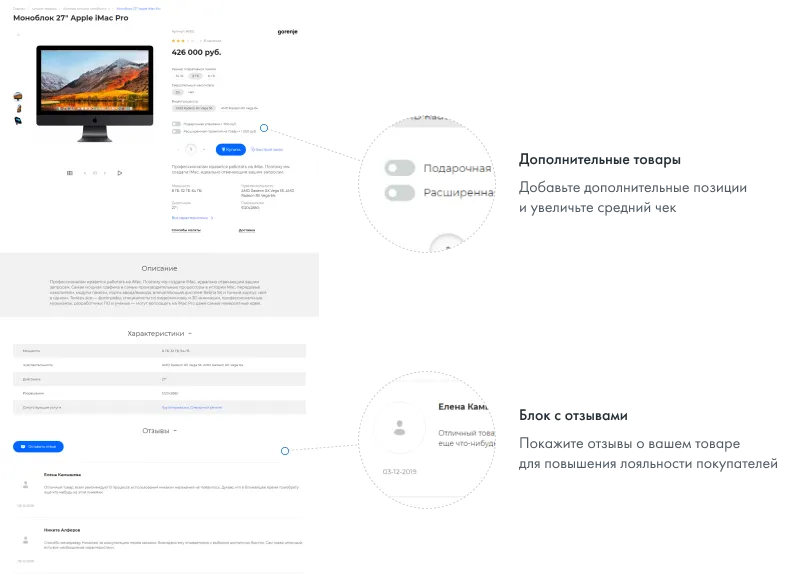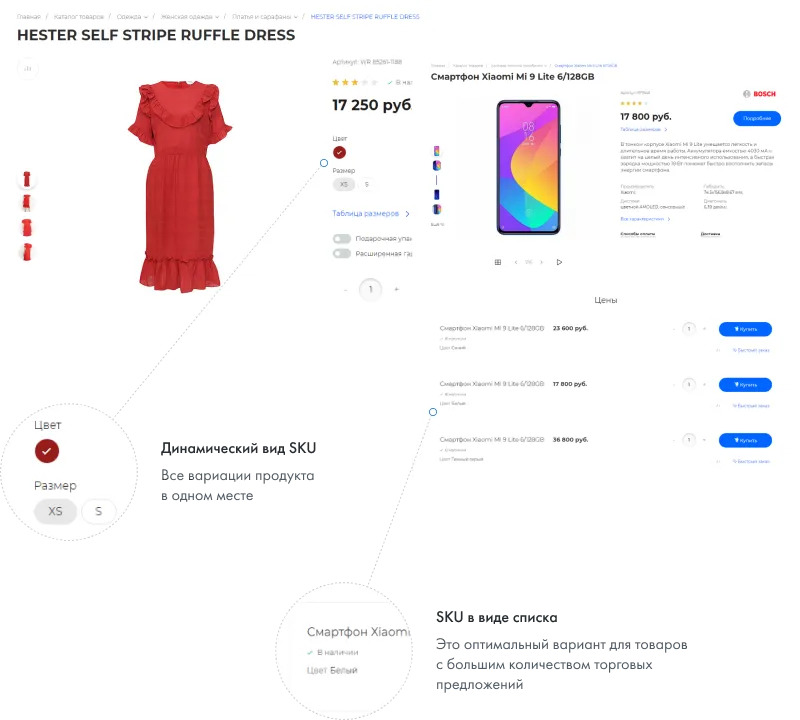 - гибкая настройка карточки товара: несколько типов товаров (промышленные товары, потребительские товары, одежда, услуги, недвижимость), выбор типа SKU, быстрый просмотр;