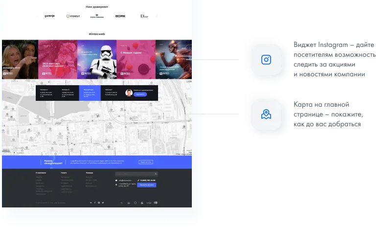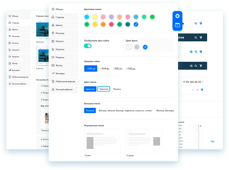 - настройка шапки сайта, футера, хедера (более 10 готовых конфигураций);