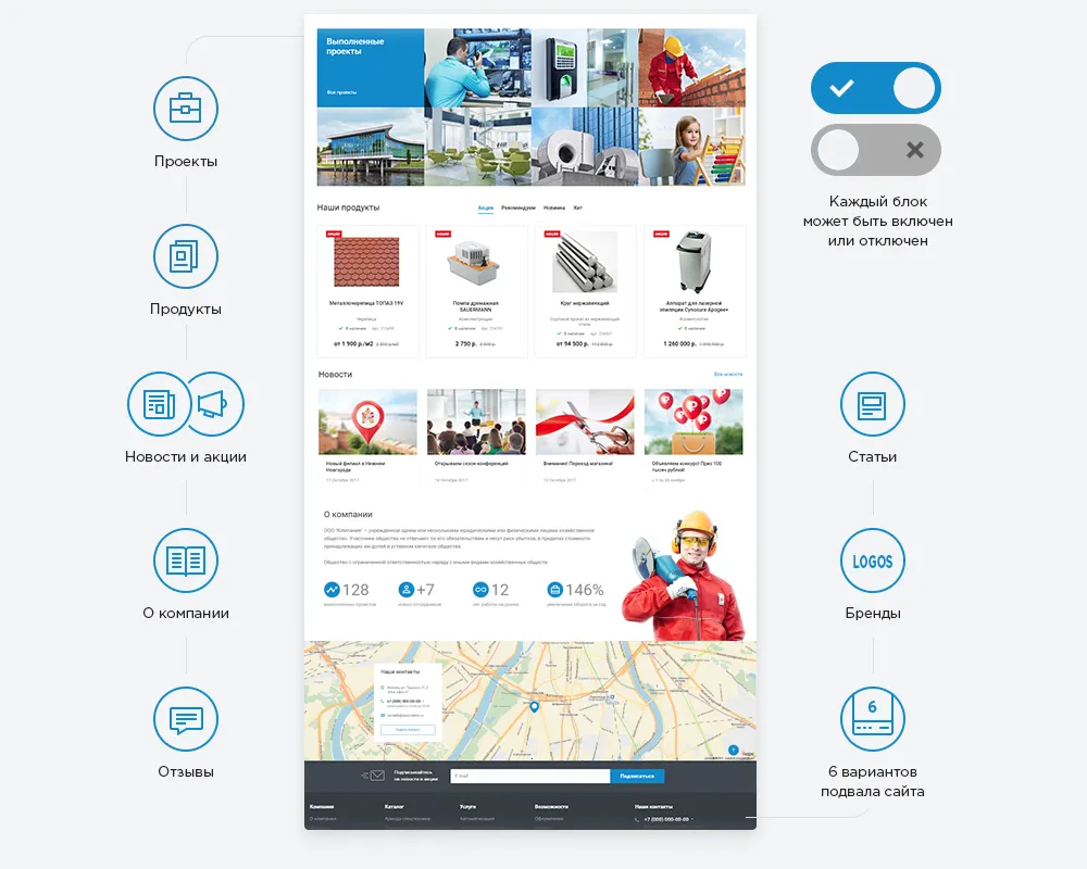 4 варианта главной страницы включают все необходимое для презентации компании – основные баннеры, блоки тизеров, услуг, портфолио, каталога, новостей и акций. Дополнительно вы можете вывести отзывы, корпоративный Instagram, бренды, блок о компании и бренды.