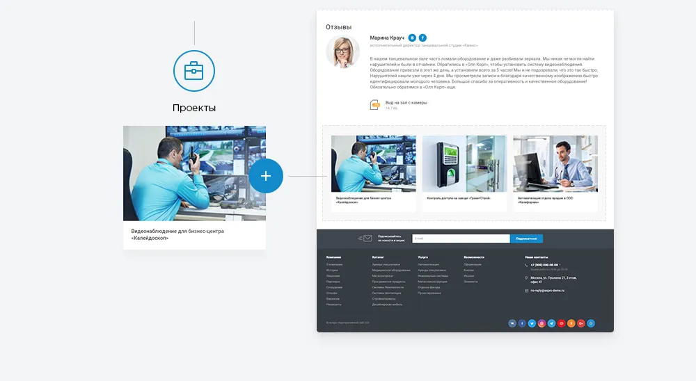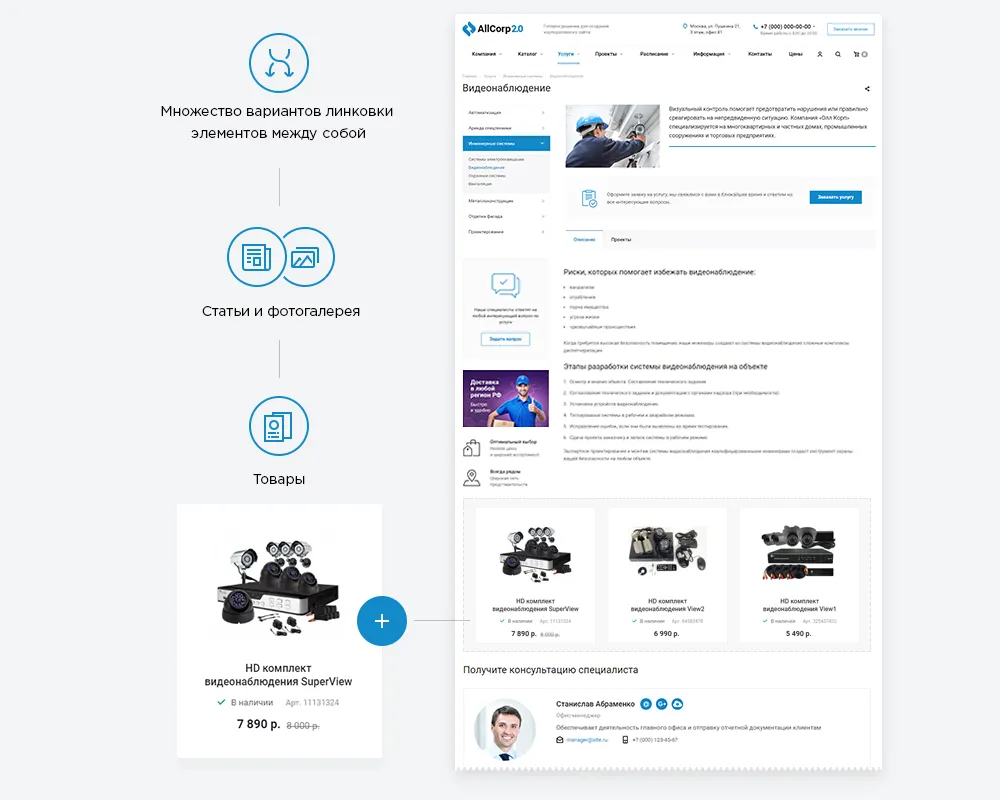 Все составляющие вашего сайта – акции, товары, услуги, отзывы, проекты – будут работать на усиление друг друга и увеличивать конверсию всего сайта. Связывайте отдельные элементы в пару кликов: акции – к услугам и товарам, товары и ответственных сотрудников – к услугам и проектам.