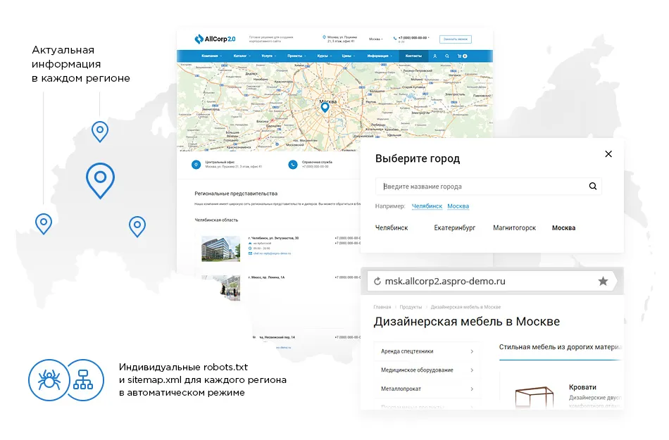 Для регионов предусмотрена генерация тегов с наименованием – например, «Аренда спецтехники в Челябинске» и «Аренда спецтехники в Москве». Также вы сможете создавать индивидуальные файлы robots.txt и sitemap для каждого региона. Мы создали все возможности, чтобы сократить ресурсы на продвижение сайта в нескольких городах. Используйте функционал на максимум!