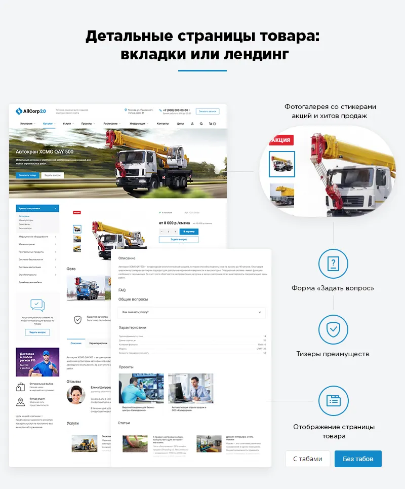 - 7 вкладок для информации о товаре: тарифы, описание, фотогалерея, реализованные проекты, характеристики, документы, FAQ