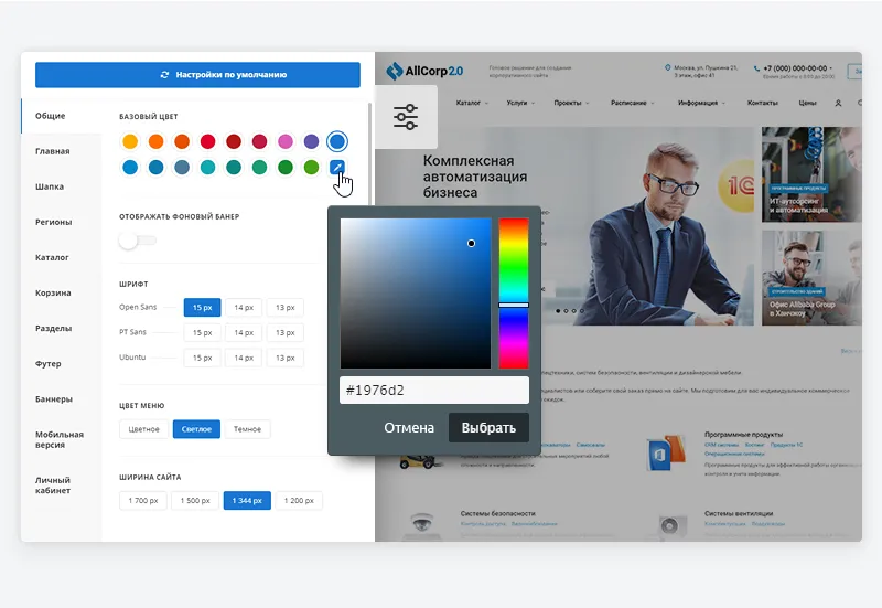 Все настройки оформления собраны в едином Центре управления Аспро и виджете в публичной части сайта. Выберите нужные настройки с предпросмотром вариантов внешнего вида и компоновки страниц, а затем сохраните их в админке в 1 клик.