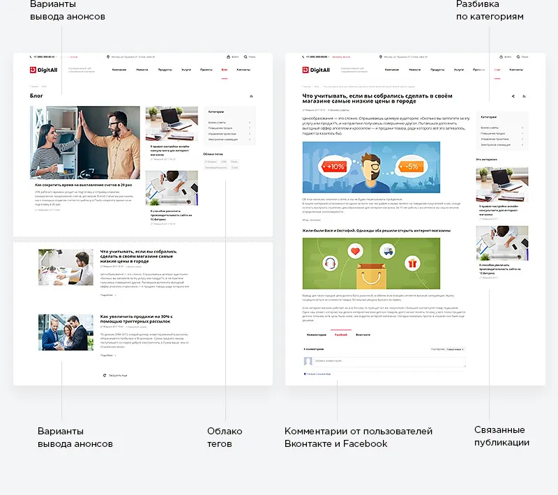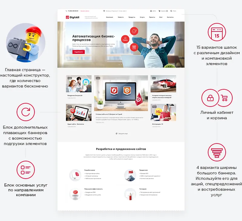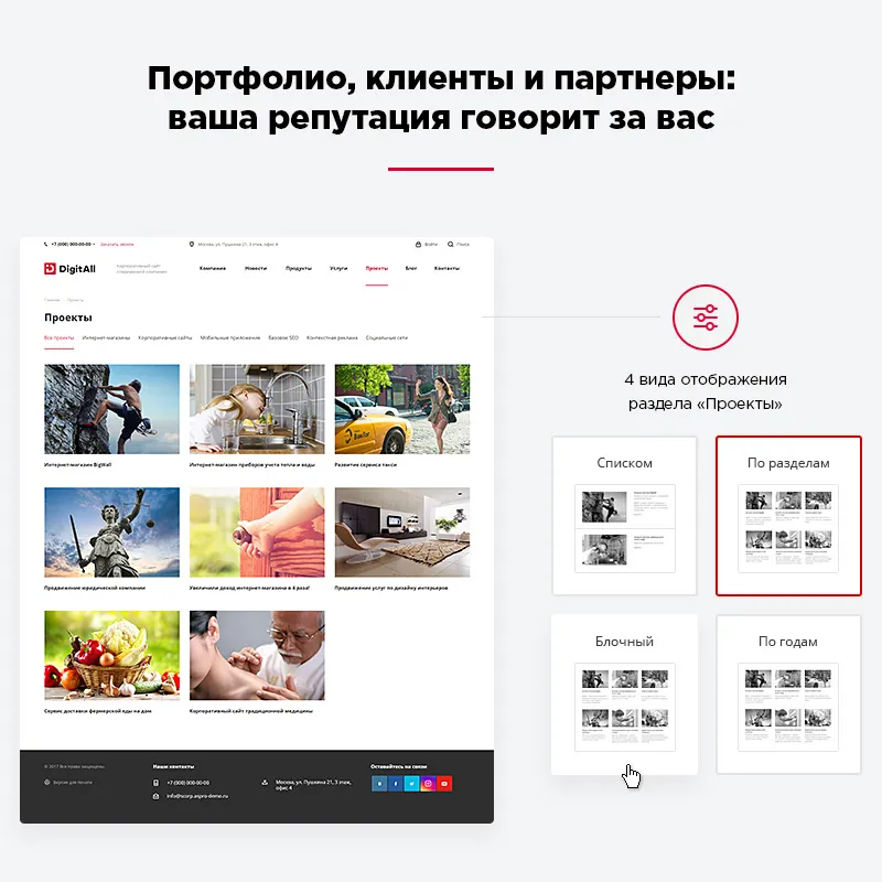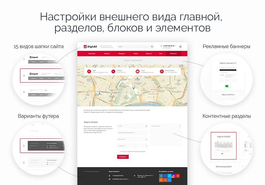 - 22 варианта отображения разделов «Контакты», «Блог», «Проекты», «Новости», «Компания» (партнеры, вакансии, лицензии).