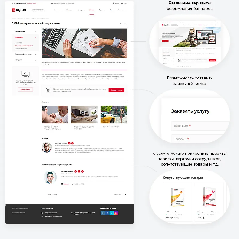 Привязывайте к услуге таблицы тарифов, выполненные проекты, карточки ответственных сотрудников и сопутствующие товары. Это позволит рассказать об услуге максимально подробно и донести самое важное до посетителя, не перегрузив его обилием информации в виде текста.