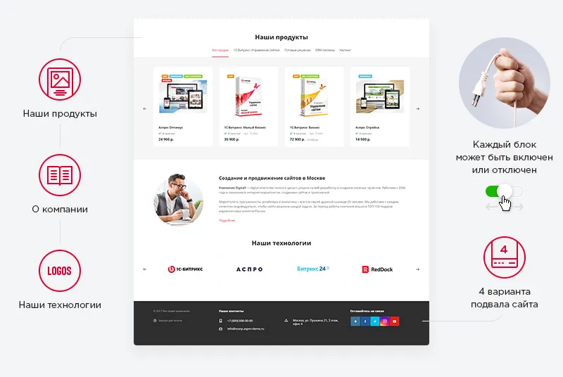 Основные блоки и элементы для того, чтобы вы смогли рассказать о себе столько, сколько нужно, и то, что нужно. В решении предусмотрено несколько вариантов компоновки главной страницы: с акцентом на портфолио и услуги – для веб-студий и интернет-агентств, на программные продукты – для интеграторов. А если хотите, превратите главную в стильный лендинг!
