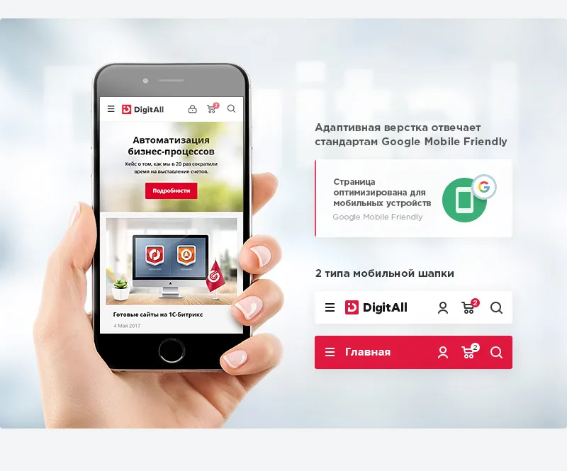 Будьте в высшей лиге! Адаптивная верстка, которая не уступает полноценной мобильной версии и отвечает стандартам Google Mobile Friendly. Функционал, который можно было встретить только на крупных и дорогих проектах, доступен пользователям готового решения. Свайп-меню и специальные настройки: белая или цветная мобильная шапка, подробное или краткое мобильное меню с настраиваемым способом отображения выдвигается слева или сверху. |