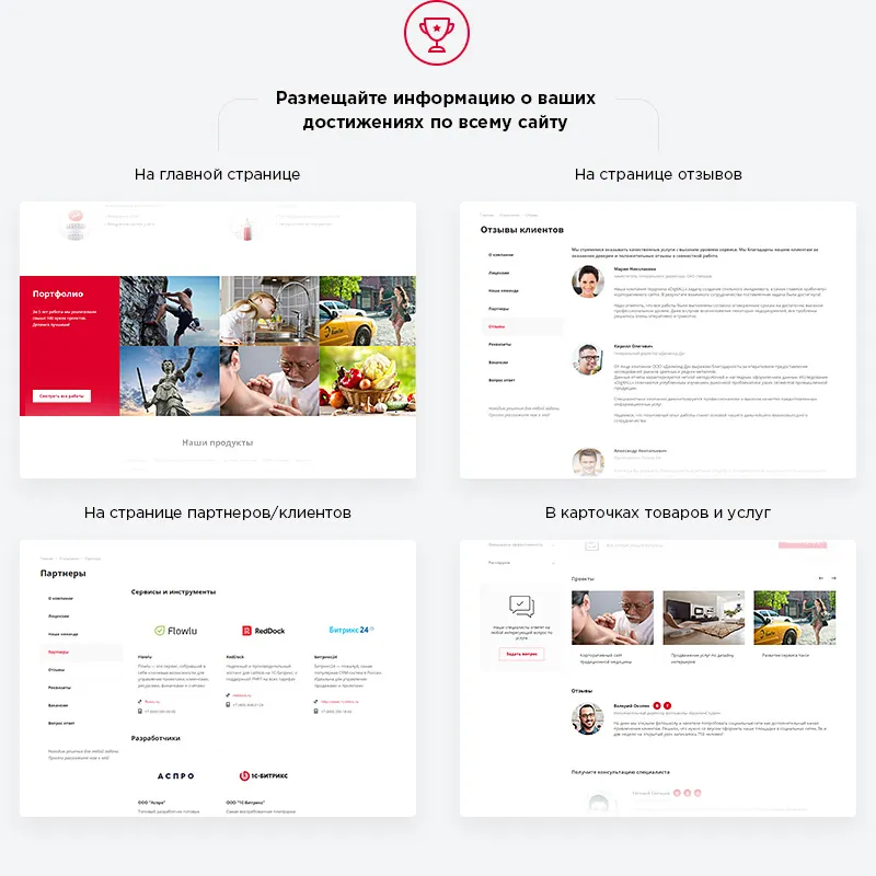 Индивидуальные тизеры преимуществ и информацию о разработчике к каждому товару, страницы портфолио, сотрудников и отзывы – к услугам. Акции – к тем и другим. Отзывы клиентов и услуги – к выполненным проектам. Пробуйте различные варианты и повышайте конверсию сайта! И никакого дублирования контента.