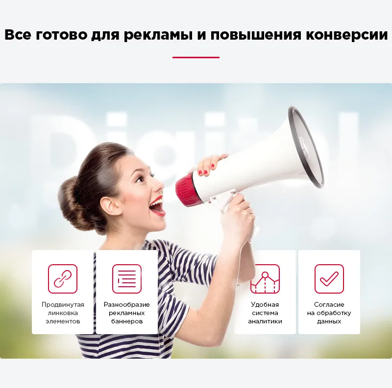 Расширенные возможности для маркетологов. Корзина с возможностью оформить заказ, личный кабинет клиента, баннерная сетка с отдельными настройками, простая настройка аналитики и ремаркетинга, бережное отношение к персональным данным и возможности для кросс-продаж – все инструменты для повышения конверсии под рукой!