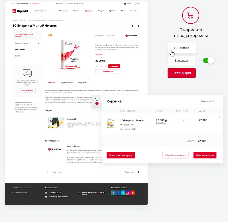 - настройки для каталога товаров: вертикальный или горизонтальный умный фильтр, 3 вида корзины (в шапке, боковая, летающая)