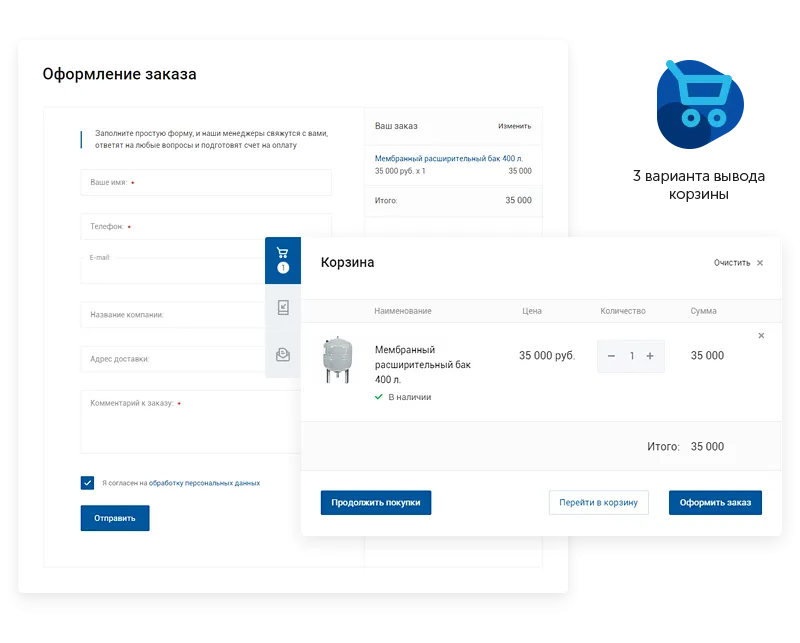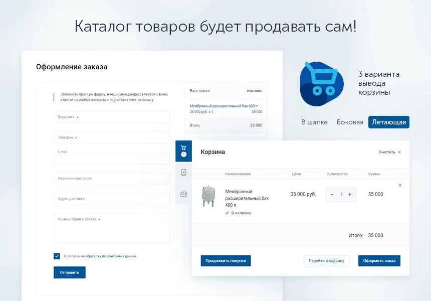 Если на вашем проекте можно добавить товары в корзину, выбирайте ее расположение для удобства пользователей. Доступно 3 вида отображения корзины: боковая, летающая и в шапке. Менеджерам поступающие заявки позволят быстро и качественно обрабатывать запросы покупателей. Отпадет необходимость звонков клиентам с уточнением товарных позиций. Вся необходима информация будет представлена в административной части сайта.