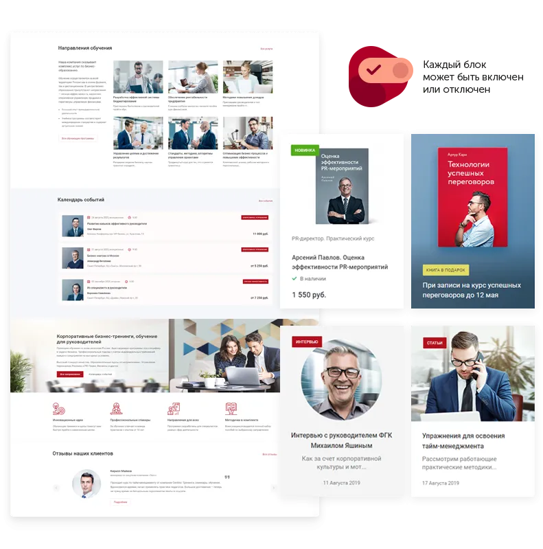 - 18 готовых блоков для главной – баннеры, тизеры, календарь событий, направления курсов и другие;