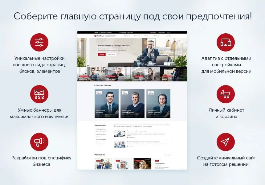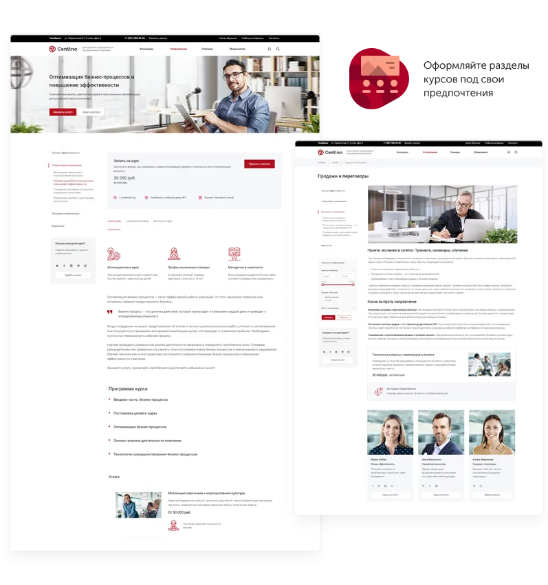 Для быстрого запуска и настройки проекта достаточно обладать базовыми знаниями контент-менеджера. Гибкие настройки и широкие возможности значительно упрощают работу с решением и позволяют оценить его особенности до запуска проекта. Посмотрите демо-версию Centino: Тренинги, семинары и обучение, познакомьтесь с возможностями и запустите ваш сайт.