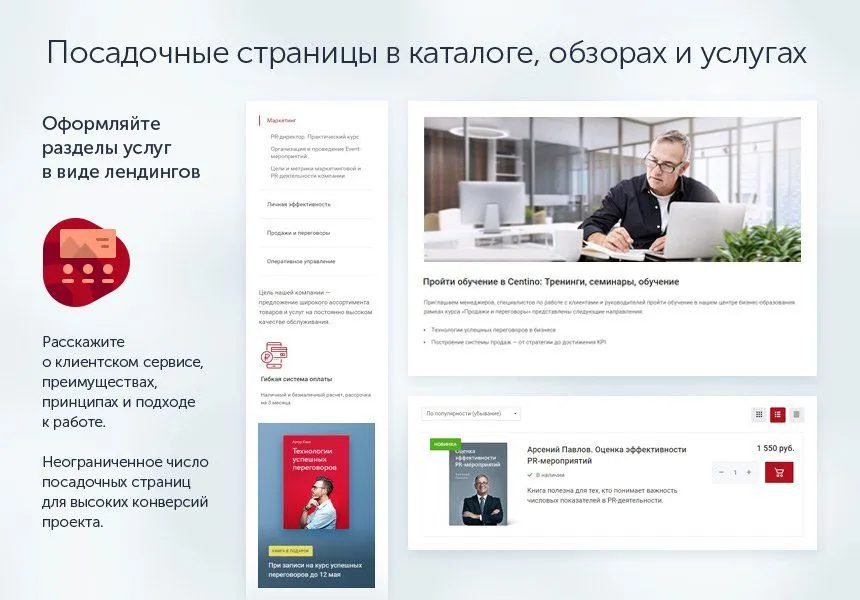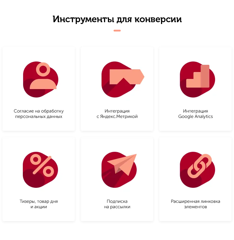 - Удобные возможности для маркетологов. Перезентуйте лучшие предложения с помощью посадочных страниц на отдельных страницах в обзорах, услугах или каталоге. Используйте простую интеграцию с Яндекс.Метрикой и анализируйте эффективность работы рекламных кампаний.