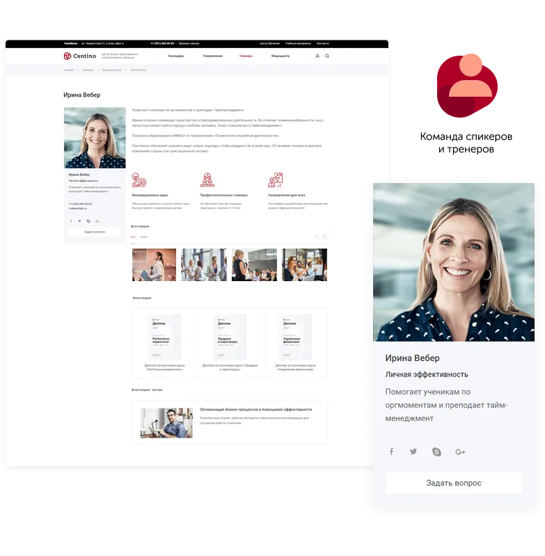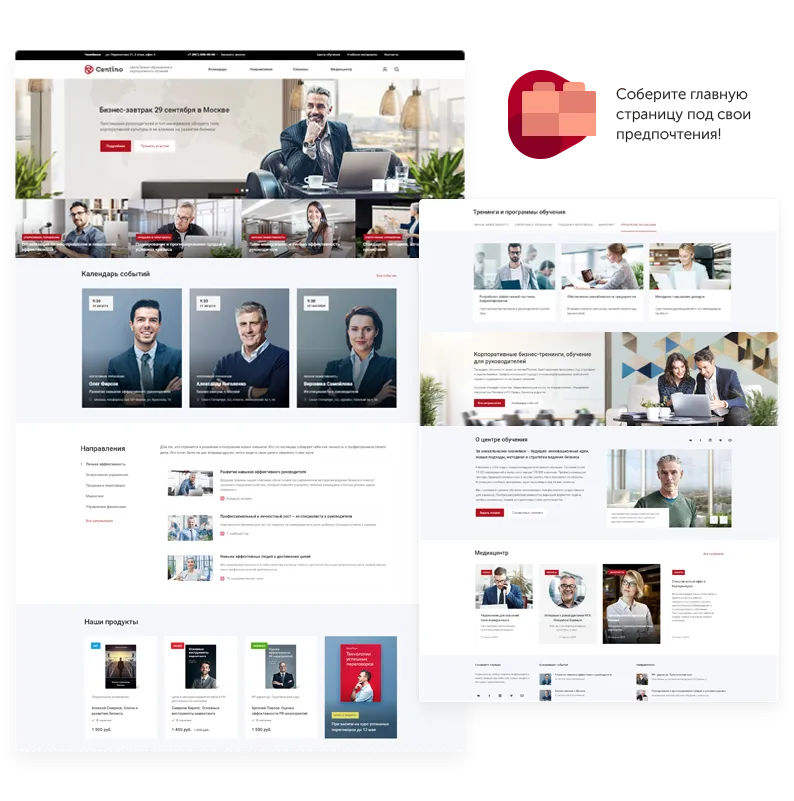 Centino: Тренинги, семинары, обучение – корпоративный сайт для компаний в сфере повышения квалификации, бизнес-тренингов и семинаров. Готовое решение заточено под специфику образовательной деятельности и содержит подходящий функционал – календарь событий, карточки спикеров, учебные пособия, программы курсов и онлайн-запись.