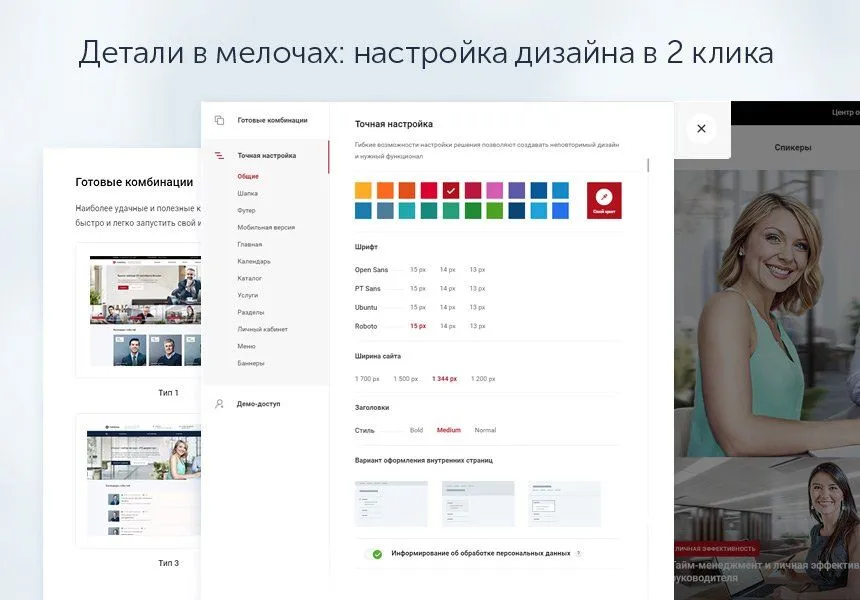 - Гибкие настройки оформления. Выберите подходящее сочетание нужных блоков, их порядок и вид отображения. Установите свой фирменный цвет,  шрифт и адаптируйте сайт под специфику бизнеса в пару кликов.